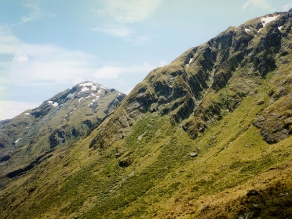 After climbing Conical Hill, we returned to the Harris Saddle Shelter to collect our packs, and at 12:30 pm we began hiking along what is in effect a contour path on the western side of Ocean Peak from the shelter towards Lake Mackenzie. This is a photograph looking back at Conical Hill. The contour path is clearly visible about a quarter of the way up from the bottom of the picture. |