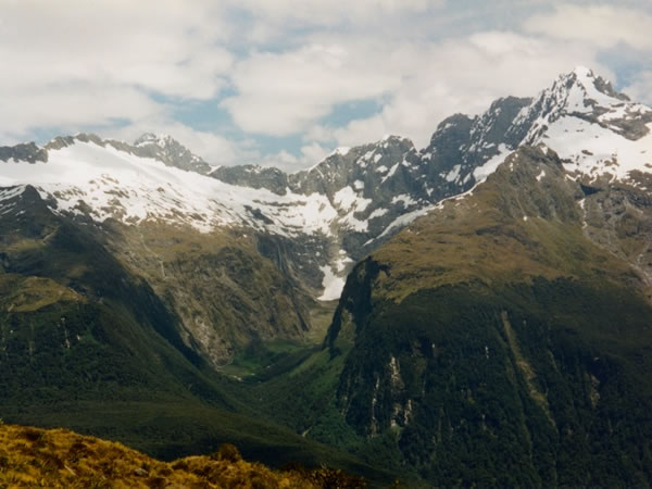 A view from the contour path looking across the Hollyford Valley at the Darran mountains.