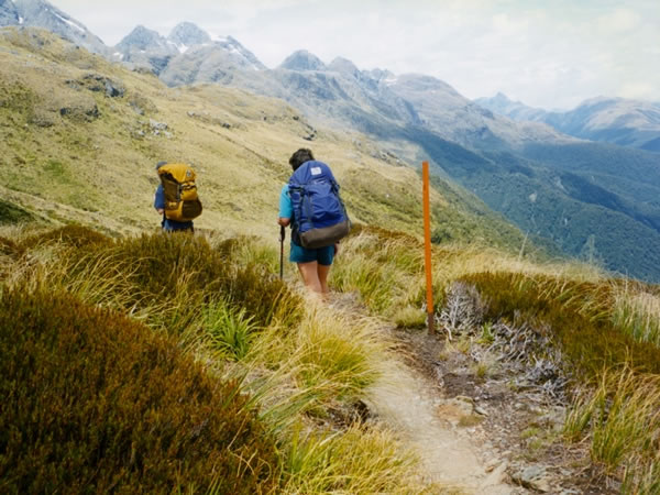 Heather (nearest the camera) and Keith on the contour track between the Harris Saddle Shelter and Lake Mackenzie.