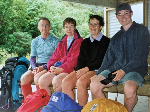 Joy, Heather, Keith, and me waiting at The Divide for a ‘Kiwi Discovery’ bus to take us back to Queenstown. I’m looking a bit worried about whether or not the camera’s timer mechanism is going to work, but the others are all looking happy at the end of our three-day, two-night, roughly 40-kilometre / 25-mile hike. |