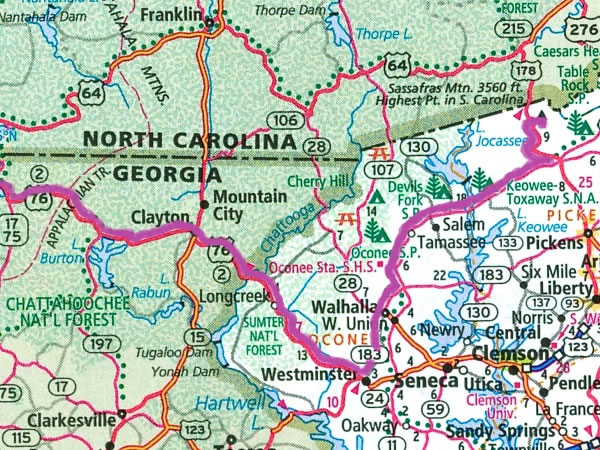 On Wednesday morning, 28 October 2015, I set out from Blairsville and drove east on US federal highway 76 to the Georgia / South Carolina state line. I then continued driving on US-76 until I reached Westminster, South Carolina, when I turned left and drove north on South Carolina state highway 183 until it intersected with South Carolina state highway 11, which I followed for 23 miles / 37 kilometres prior to turning left onto US federal highway 178. I then travelled six miles / ten kilometres on US-178 before turning right onto the F. Van Clayton Highway – which is, in reality, only a narrow mountain road – and I drove up it for 4.7 miles / 7.5 kilometres to the car park that’s below the summit of Sassafras Mountain. |