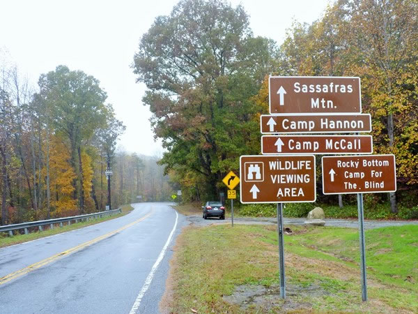 Shortly before 1:00 pm, I turned left off South Carolina state highway 11 and, as these road signs at the intersection indicated, I was at last nearing Sassafras Mountain.