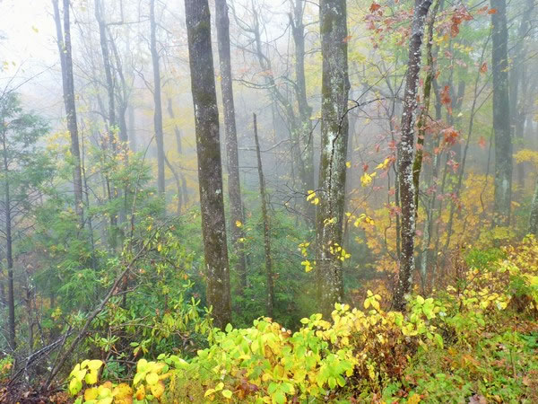 Looking down into the woods beside the parking lot near the summit of Sassafras Mountain.
