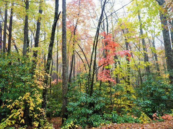 Looking past evergreen rhododendron bushes and into woods displaying a range of autumn colours on the lower slopes of Sassafras Mountain.