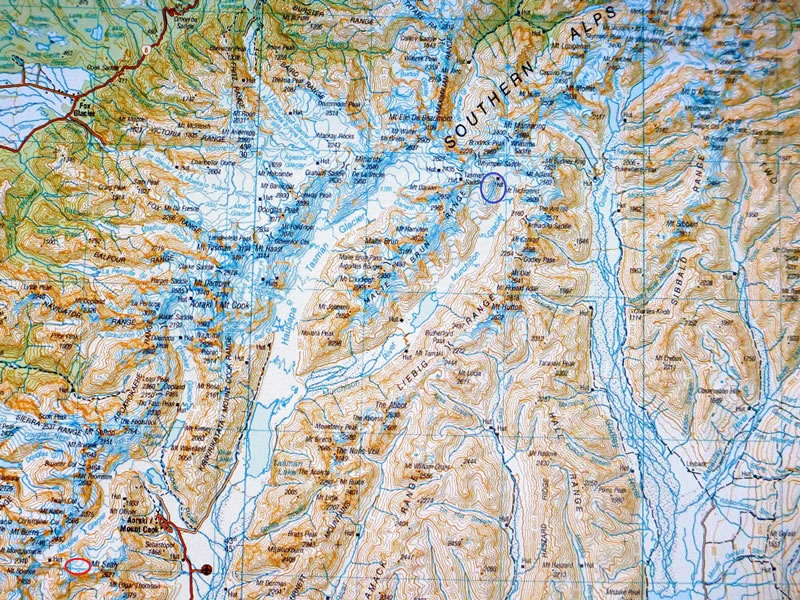 After Gerry Kennedy and I climbed Mt Aylmer on Thursday morning, 31 March 1994, we went back back to Kelman Hut, which is near the head of the Tasman glacier. The weather forecast was not promising, so Gerry made a quick – but extremely well-judged – decision to leave the hut and fly south, where if needs be we’d be able to get out of the mountains under our own steam. On this map, I’ve ringed the area we flew from in blue, and the area we flew to (which is in the bottom left-hand corner of the map) in red. |