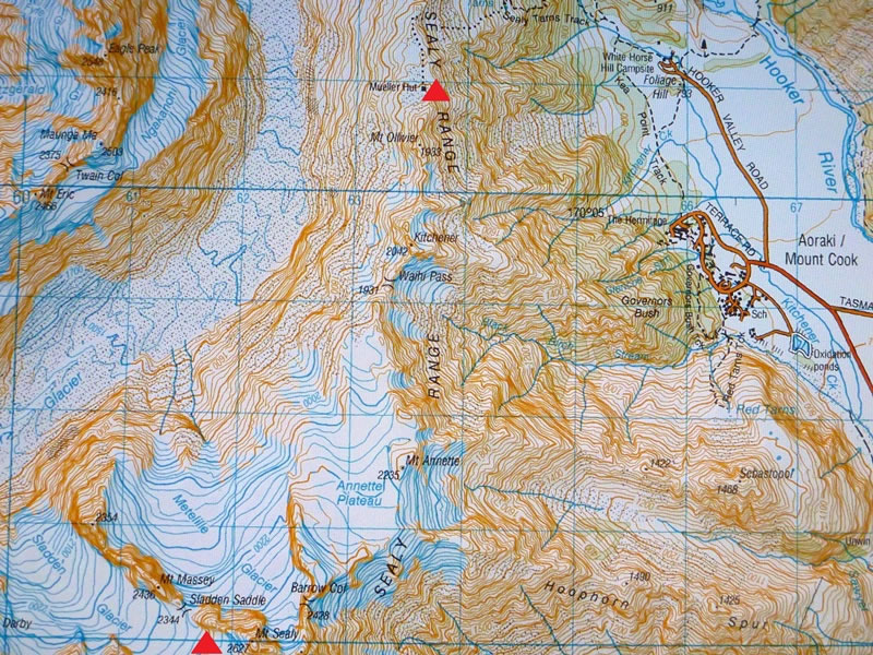 This map shows where we spent the next two nights. On Thursday, 31 March 1994, we camped on the southern side of Mt Sealy, near the head of the Sladden glacier; and after climbing Mt Sealy on Friday, 1 April 1994, we trekked north to the Mueller Hut and stayed overnight in it. Both locations have been marked with a red triangle. |