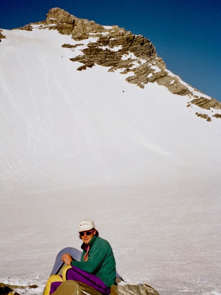 Gerry relaxing at our campsite, with the south face of Mt Sealy behind him.