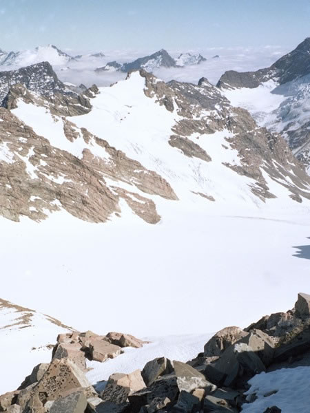 Looking down from the summit of Mt Sealy onto the Sladden glacier.