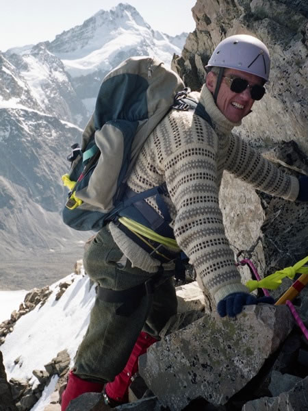 What goes up must come down: Gerry took this photo of me as I started to climb down through Mt Sealy’s rocky summit ramparts. If I look somewhat nervous in this picture, it’s because I was: I didn’t like rock-climbing with crampons on (and I never became entirely accustomed to doing so). |