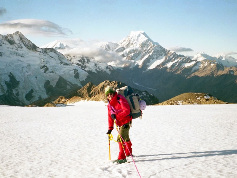 … and Gerry took this picture of me. We were heading for the Mueller hut, but our progress was painfully slow. While trying to walk on the glacier’s surface, our boots frequently broke through the crust on the surface of the snow and we dropped down into holes as far as our knees or even deeper. Not knowing what would happen every time you took a step forward was both nerve-wracking and exhausting. The sun set shortly after we reached the end of the snow field, and we then had to navigate in the dark, carefully trying to avoid a maze of rock crevasses. |