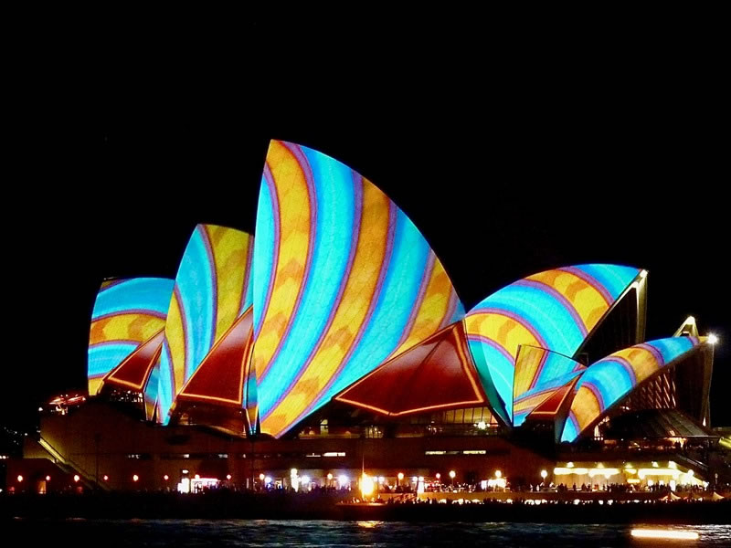 Architecture / buildings – Australia: The Sydney Opera House – designed by the Danish architect, Jørn Utzon – was built in the late 1960s and early 1970s. It has been called “one of the world's most famous and distinctive buildings”, so much so that it was included in a list of the ten best buildings of the last millennium. Striking by day, the opera house is stupendous when it’s illuminated during the annual Vivid Sydney festival (which was being held when I took this photograph on 31 May 2013). |