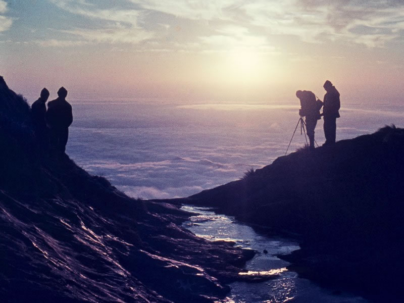 Dawn – South Africa: I took this photograph in July 1962 of fellow climbers standing alongside the frozen Tugela river at the edge of the Drakensberg escarpment and watching the sunrise. Dave Dodds, the person with the tripod, was a South African dentist. He was my climbing mentor; this picture was taken on the last of three climbing trips I went on with him in 1961 and 1962. |