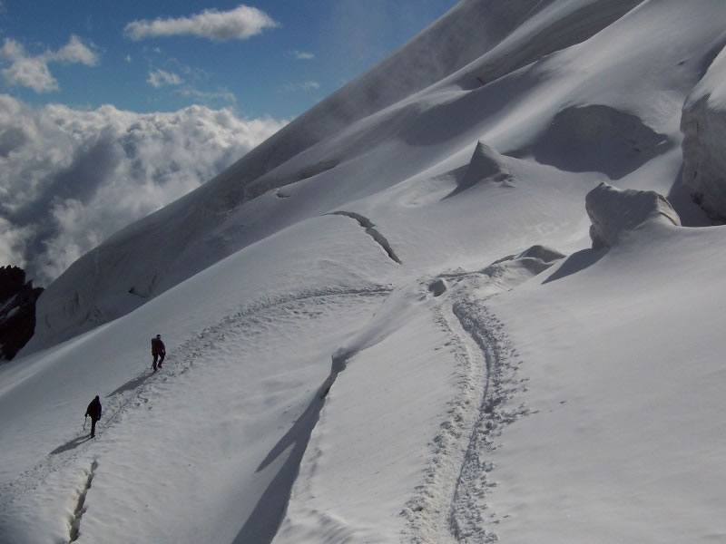 While descending from the 4,027 m / 13,212 ft summit of Allalinhorn on 19 August 2004, I photographed these two climbers heading up the mountain.