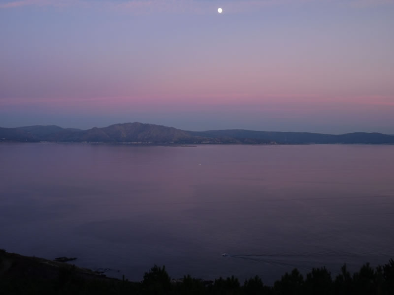 , The End of the Earth), I turned round and witnessed the moon rising over the bay between Finisterre and O Pindo. I took this photograph at 7:55 pm on 20 October 2010.