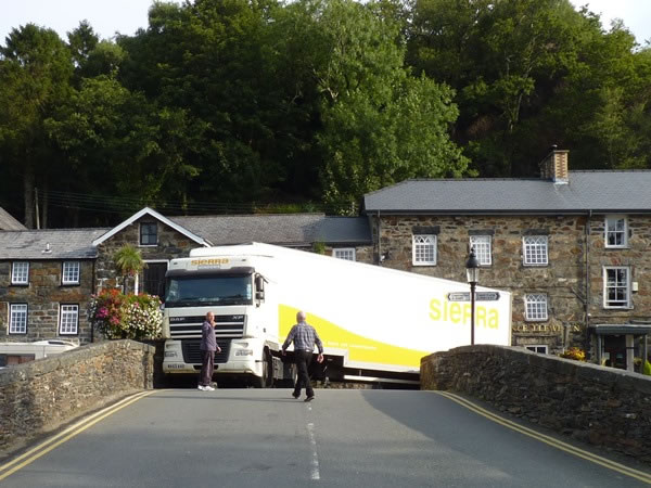 We left the Gwesty Bodlondeb Hotel after breakfast on Friday morning, 11 September 2015, and set off for Pen-y-Pass, which is on the eastern flanks of Snowdon and is only about 32 kilometres / 20 miles from Criccieth. However, when we reached Beddgelert, a village with only about 500 inhabitants, roughly half-way between Criccieth and Pen-y-Pass, we thought we might possibly be able to go no further: this large truck was firmly wedged against the walls on both sides of an old stone bridge over the River Colwyn. Fortunately, a more experienced truck driver volunteered to help the Sierra truck’s hapless driver, and after about twenty minutes the blockage was cleared. |