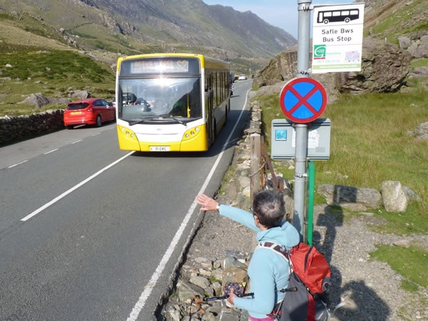 We left our little red Ford Focus rental car in an official Pass of Llanberis parking bay, crossed the road, and at 10:17 am caught a bus back up the hill to Pen-y-Pass.
