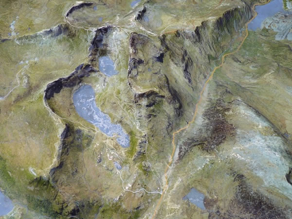 I took this photograph in the Pen-y-Pass information centre of a model of Snowdon and its surrounds. Pen-y-Pass is near the bottom of the picture at the junction where the yellow line illustrating the A4086 road and two white lines depicting walking paths meet. |