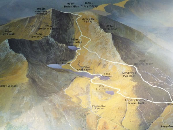 Heather and I decided we would follow the Miners’ Track up Snowdon, and this photograph of an illustrated route map that was displayed near Pen-y-Pass shows both the Miners’ Track and (above it) the Pyg Track. The Miners’ Track begins more gently than the Pyg Track, though both routes obviously climb the same vertical height (723 metres / 2,372 feet) and are roughly the same length (namely, 13 kilometres / 8 miles there and back). |