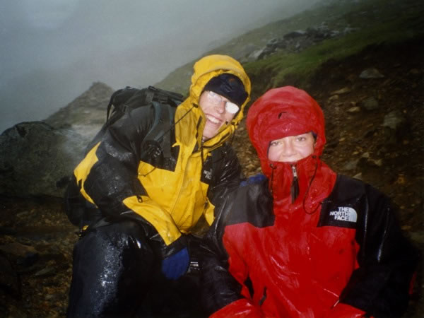 … on Saturday, 24 October 1998, Aidan and Rachel Brennan (wearing yellow and red parkas respectively) and I set out to climb Snowdon via the Pyg Track. The three of us encountered dreadful weather: torrential rain and wind gusts of 130 kilometres per hour / 80 miles an hour literally blew us off our feet. |