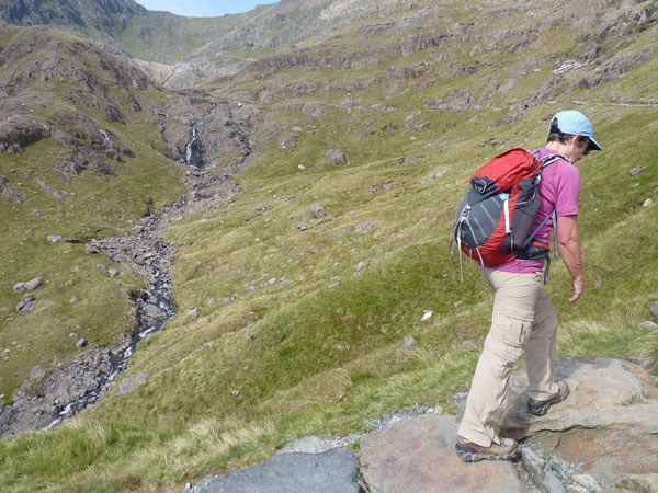 Heather heading up the glacial valley towards Llyn Glaslyn lake.