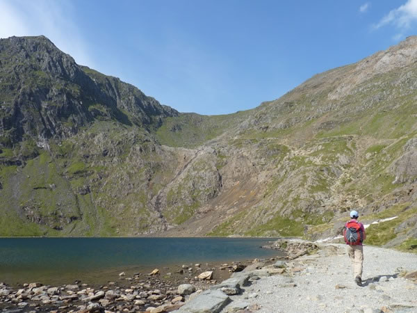 … Llyn Glaslyn (which is also known as Blue Lake). It is a classic example of a glacial lake above a hanging valley (namely, the valley we had just climbed up after leaving the shores of Llyn Llydaw). The steepest section of the Miners’ Track up Snowdon is the headwall in the middle of the picture. The climb up the headwall starts directly above Heather’s head and then angles left and up towards the lowest point on the horizon, which is called Bwich Glas and is on the ridge separating Snowdon and Garnedd Ugain (the second-highest peak in Wales, the summit of which is only 20 metres / 66 feet lower than the top of Snowdon). |