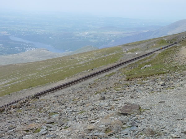 Rather like Mt Washington, the highest mountain in New England, there’s a railway line that goes to the top of Snowdon! It’s on the northern side of the ridge between Snowdon and Garnedd Ugain. In this photograph people can also be seen heading down the Llanberis Path, “the easiest and longest of the six main paths to the summit of Snowdon.” Far below, near the top left-hand corner of the photograph, are the town of Llanberis and Llyn Padarn (which, according to Google Translate, means Paddle Lake). |