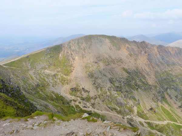 I took a series of photographs looking north-east from the top of Snowdon. I had hoped I might be able to stitch them together to make a single panoramic picture, but that couldn’t be done, so I’ll show three of them separately. This is the first of the three. It looks predominantly north towards Garnedd Ugain (1,065 metres / 3,494 feet). Bwich Glas, in the middle of the left-hand edge of the picture, is the point at which the combined Miner’s Track and Pyg Track meet the ridge between Snowdon and Garnedd Ugain. |