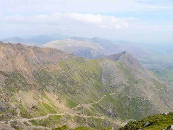 In the second of the three not-quite-a-panorama pictures, the two main trails up the eastern side of Snowdon stand out clearly: the Pyg Track is the upper and the Miners’ Track is the lower of the two.