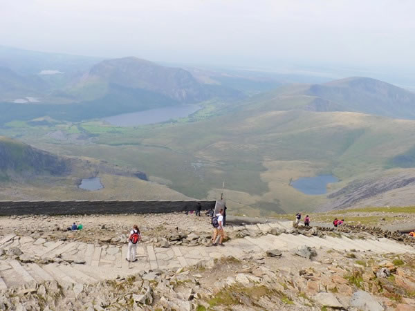 This is a view looking north-west from the summit of Snowdon. The largest of the lakes in the photograph is Llyn Cwellyn which is, in fact, a reservoir (and not a natural lake).