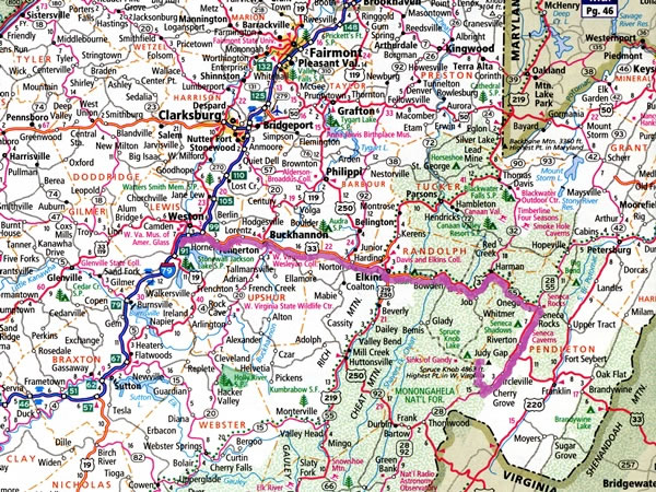 On Thursday morning, 5 November 2015, I drove north-east on US Interstate highway 79 from Charleston, West Virginia (which is off the bottom left-hand corner of this map). Near Weston, I turned right at exit 99, off I-79 and onto US federal highway 33, and I travelled east on it as far as Seneca Rocks. US-33 then turns south, and I continued following it for another ten miles / sixteen kilometres, before turning right and driving up Briery Gap Road, Forest Road 112, and Forest Road 104 to a parking lot near the summit of Spruce Knob. |