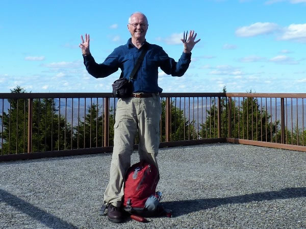 I took this photograph of myself on the top of the observation tower showing (with the aid of two pens stuck onto the back of my left hand) that Spruce Knob, West Virginia, was the 37th US state highpoint I’d either climbed or visited. |