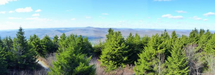 A three-shot panoramic photograph looking south-west from the summit of Spruce Knob, West Virginia.