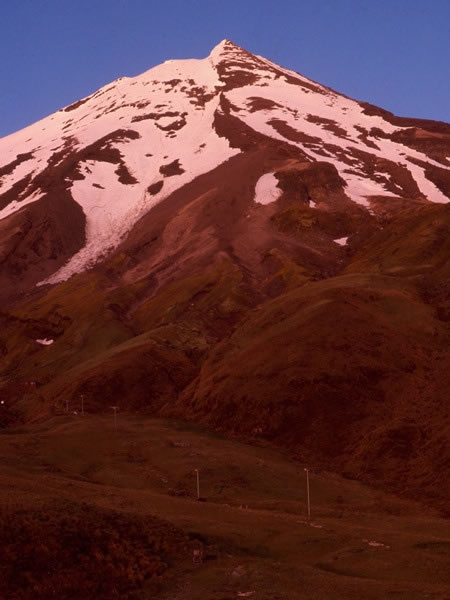 January 1987: An early morning view of the eastern slopes of Mt Taranaki, which I’d decided would be the most straight-forward route up the mountain. As can be seen from this photograph, with a little bit of zig-zagging, there was an almost completely snow-free route up the mountain as far as the foot the Shark’s Tooth. |