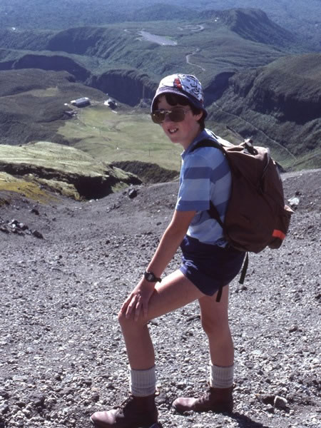 January 1987: Evan (who was just six days shy of his 12th birthday) pausing on the first major scree field above the grassy slopes of the Manganui ski-field. The public shelter in which we’d spent the night is the smaller of the two buildings to the left of Evan’s head, while the car park where we’d left our car the previous evening can be seen above Evan’s head near the top of the picture. |