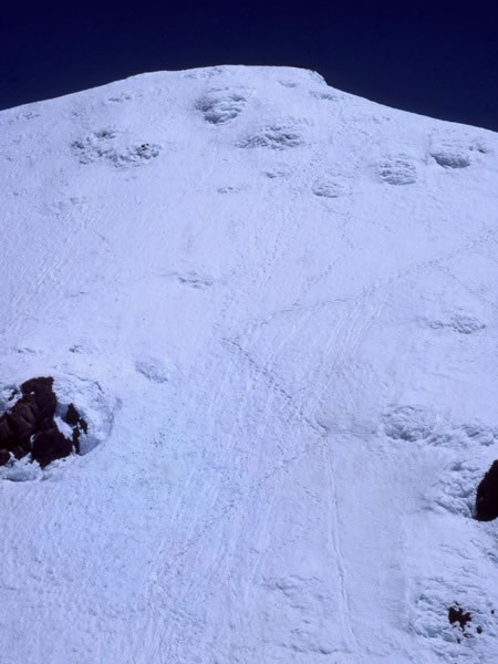 January 1987: This was the view from the crater floor looking across at the western side of the crater and up towards Mt Taranaki’s summit. Although the crater wall looked steep, the zig-zagging line of footprints in the snow indicated that there was an obvious (and, as it turned out, fairly easy) route to the top of the mountain. |