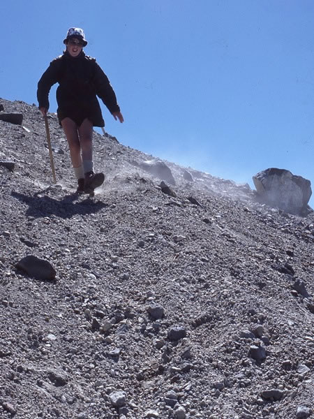 Evan (using the national parks’ ranger’s ice-axe) really enjoyed running down the scree.