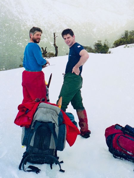 August 1995: The friends with whom I climbed Mt Taranaki the second time were Alastair Smith (who’s on the left in this picture) and Nick Shea. Alastair lectured in librarianship and information science at the Victoria University of Wellington (which is where I too taught, but in political science), while Nick was a lawyer temporarily working in Wellington but really from Lincoln’s Inn in London, where he specialized in patent law. I took this photograph of them on Saturday, 5 August 1995, during a break in our hike from the Camphouse up to the Tahurangi Lodge (which is the Taranaki Alpine Club’s 26-bed hut on the mountain). |