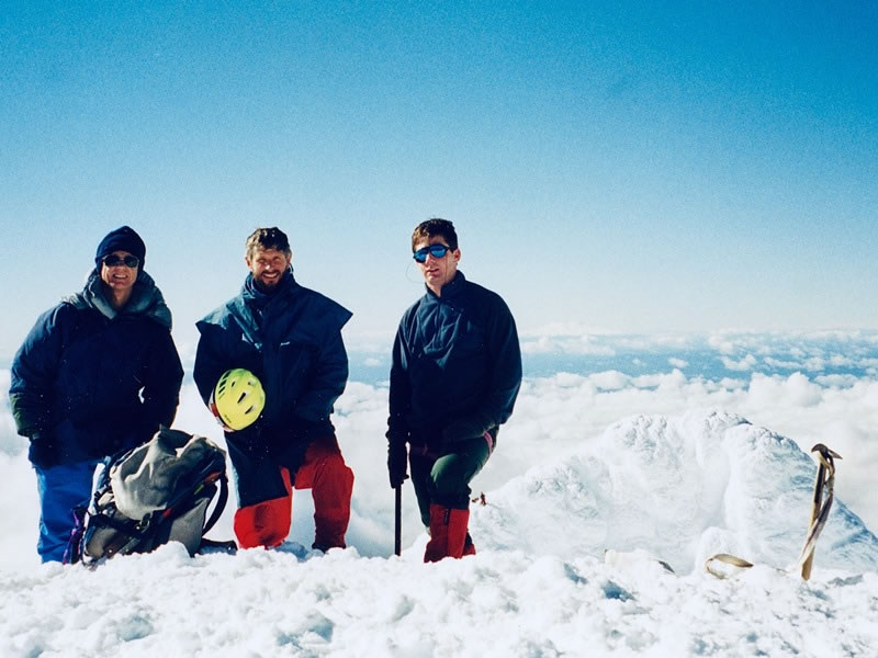 A photograph taken on the 2,518 metre-high summit of Mt Taranaki of (from left to right) me, Alastair Smith, and Nick Shea.