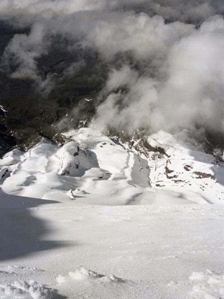 August 1995: The Shark’s Tooth is far harder than the climb up to the highest point on Mt Taranaki. The Shark’s Tooth’s billowing pillows of hard rime ice were an altogether different proposition. However, with Alastair’s encouragement and expertise, we made it. This is a photograph I took looking down Mt Taranaki’s east ridge from the 2,510 metre-high summit of the Shark’s Tooth, and … |