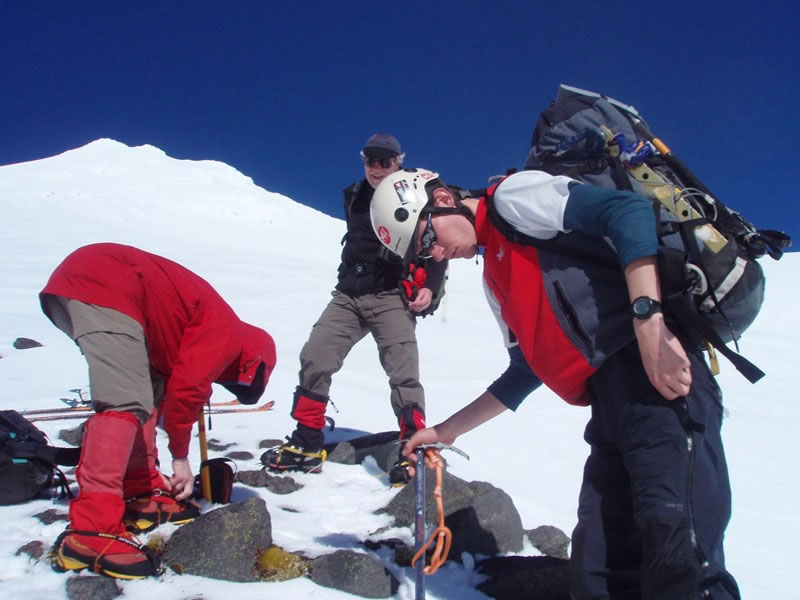 … to put our crampons on, as shown in this picture by Lorraine of (from left to right) me, Steve, and Scott.