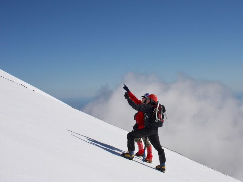Lorraine later took this photo of Rob and me trying to pinpoint landmarks – or, more accurately, ice-marks – on the mountain’s upper slopes that we needed to aim for during our climb.