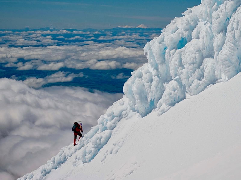 Hinrich took this photograph of me carefully cutting steps in rime ice near the entrance to Mt Taranaki’s crater. Mt Ngauruhoe is visible on the right-hand horizon.