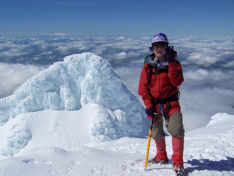 September 2008: Four-and-a-quarter hours after leaving the Tahurangi Lodge, I reached the 2,518 metre-high summit of Mt Taranaki and signalled it was the third time that I’d done so. On the left behind me are the Shark’s Tooth (2,510 metres) and (on the horizon) Mt Ruapehu (2,797 metres). Mt Ruapehu is the highest mountain in the North Island of New Zealand, while Mt Taranaki is the North Island’s second highest mountain. |