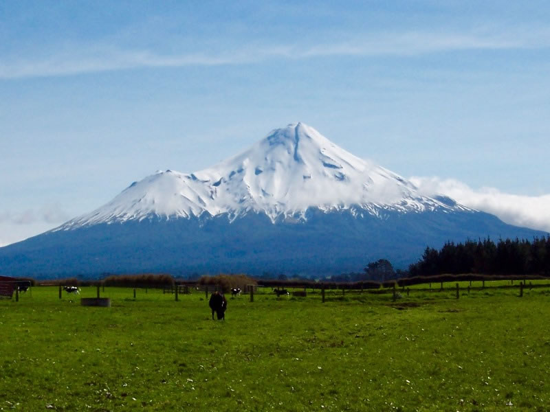 September 2008: We then drove both cars round to where we’d arranged to meet Hinrich, Rob, and Scott on the southern side of the mountain after their Mt Taranaki traverse. On the way, I stopped to take this photograph of dairy cows below the snow-covered Fanthams Peak (on the left) and Mt Taranaki. It was a classic Taranaki scene. It wasn’t the only time I stopped to take a photograph on our way back to Wellington … |