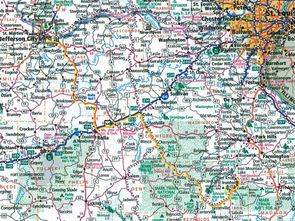 I left Jefferson City after lunch (which – appropriately for a political scientist – I ate in the Harry S Truman State Office Building’s canteen) on Friday, 25 April 2014, and drove south-east via federal highways US-63 and I-44, and Missouri state highways 49 and 21 / 72 to Pilot Knob. |