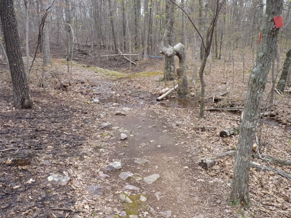 A fork in the trail: the Ozark Trail went off to the right at this junction, while the route back to the Taum Sauk highpoint was on the left.