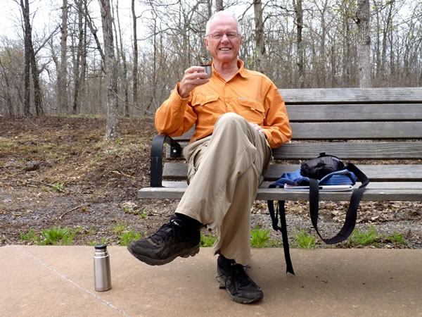 As I’d guessed would be the case, I was back at the trailhead at 12 noon – after a pleasant hike that had taken me a little less than two hours. Sitting on a bench at the trailhead I had a light lunch … and toasted my success with cup of thermos coffee! |