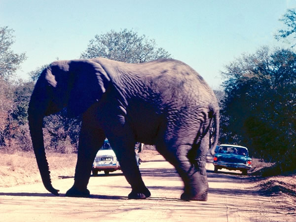 HOLIDAYS – Game reserves: An elephant crossing the road in front of our car in the Kruger National Park. In the 1950s, all the roads in the park were unsealed “sand roads” (as we called them), not least because the game reserve’s first chief ranger “vehemently opposed the building of tarred roads in the park”. However, tarring some of the roads started in the mid-1960s, and the park now has more than 800 kilometres / 500 miles of tarred roads. Thankfully, in my opinion, there are still 1,500 kilometres / 900 miles or so of sand roads. |