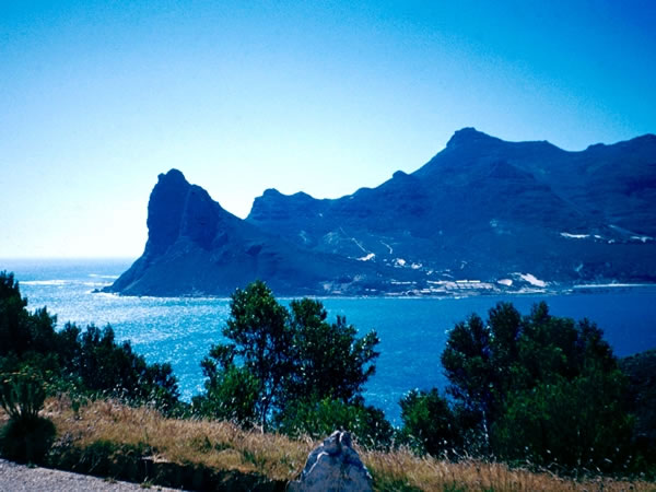 HOLIDAYS – Cape Town: In his Memoirs, Bobby recalled how on one occasion during our December 1949 Cape Town holiday, “we … [drove] with the children [south] along the Atlantic coast to Cape Point and return[ed] via the False Bay side.” This is a photograph taken by Bobby (but on another occasion) looking out from Chapman’s Peak Drive, across Hout Bay, and west at the Atlantic Ocean beyond the Sentinel, which is the prominent peak at the entrance to the bay. |