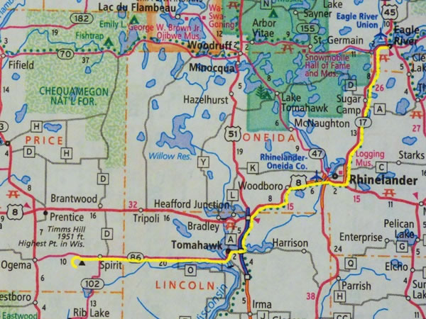 I left Eagle River on Friday morning, 25 August 2017, and drove on Wisconsin state route 17 to Rhinelander. I then took US federal highways 8 and 51 to Tomahawk, and from there headed west on Wisconsin state route 86. About five miles / eight kilometres before I reached Omega, I turned left onto County Road “C” which led to the entrance to the Timm’s Hill County Park. |